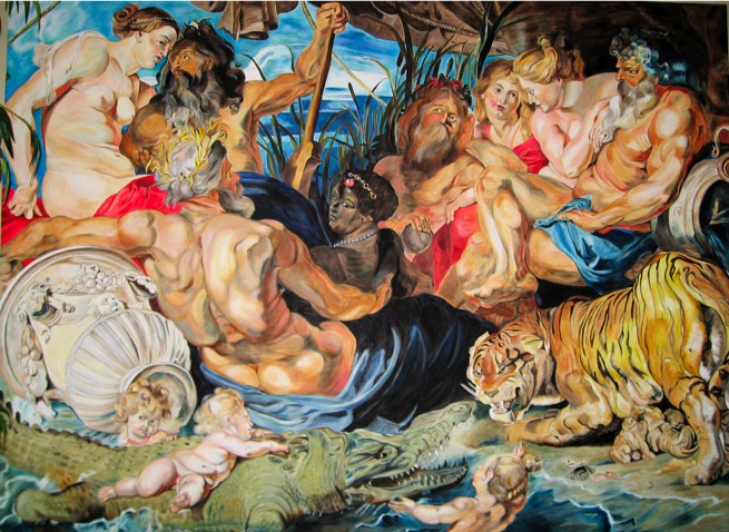 The reposing personifications of the four continents include: Europe (left, slightly elevated), accompanied by the river god of the Danube; Asia (right) with the Ganges; Africa (center) embraced by the powerful figure of the Nile; America (right background), the "youngest continent, with free-flowing hair.