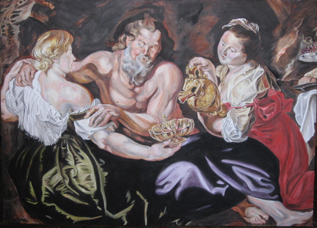 In Genesis 19, 30-38, the daughters of the aged Lot made their father drunk and lay with him to ensure descendants. The scene is set in the cave where Lot sheltered after fleeing from Sodom, which appears enveloped in smoke in the background.