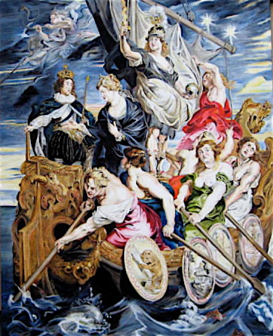 In this panel in the Medici series in the Louvre, the Dauphin’s coming of age in 1614 is represented by him taking over the rudder of the “Ship of State, which is rowed by Strength, Faith, Justice and Prudence.